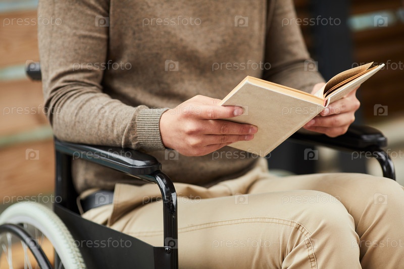 Близкий план неузнаваемого мужчины в повседневной одежде, сидящего на открытом воздухе в инвалидной коляске и читающего книгу о психическом здоровье людей с ограниченными возможностями