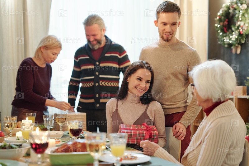 Веселая молодая женщина с коробкой для подарков делает рождественский подарок своей бабушке