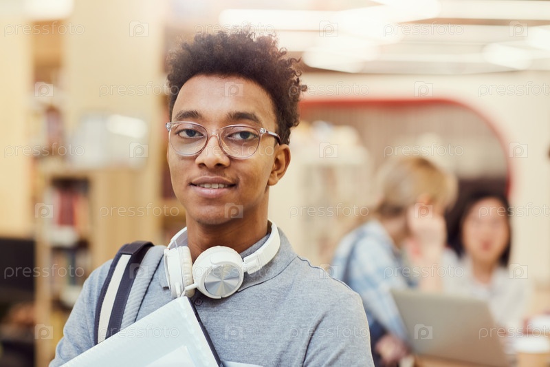 Портрет улыбающегося красивого молодого афроамериканского студента с кудрявыми волосами в очках и наушниках вокруг шеи, стоящего в библиотеке кампуса