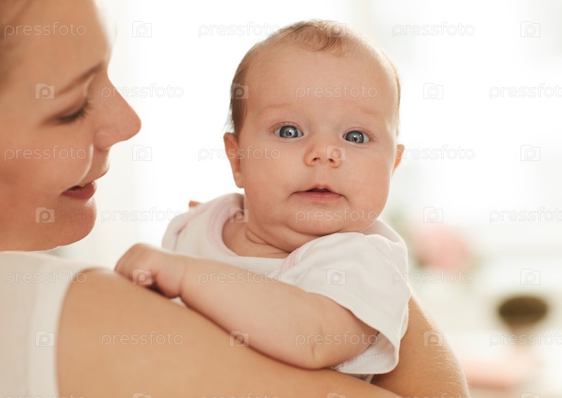 Счастливая, улыбающаяся молодая мать нежно улыбается своему голубоглазому активному маленькому ребенку в белом костюме