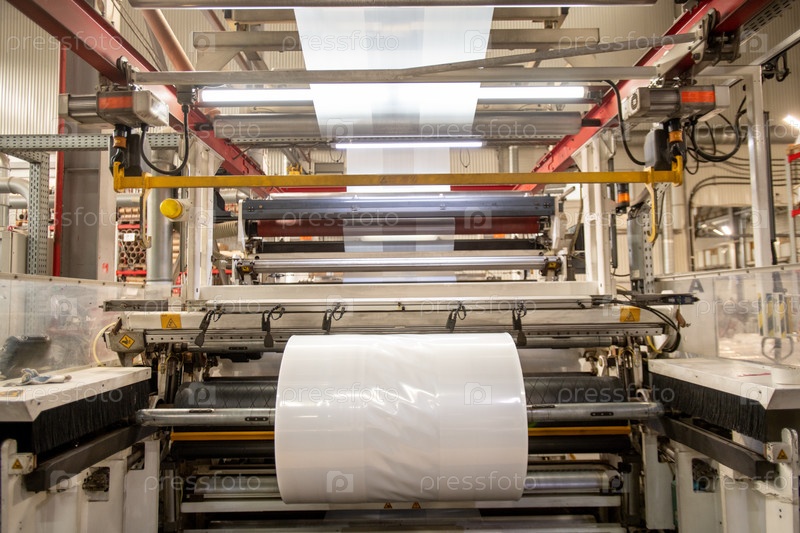 Огромная промышленная машина с прокатанной недавно произведенной прозрачной полиэтиленовой пленкой