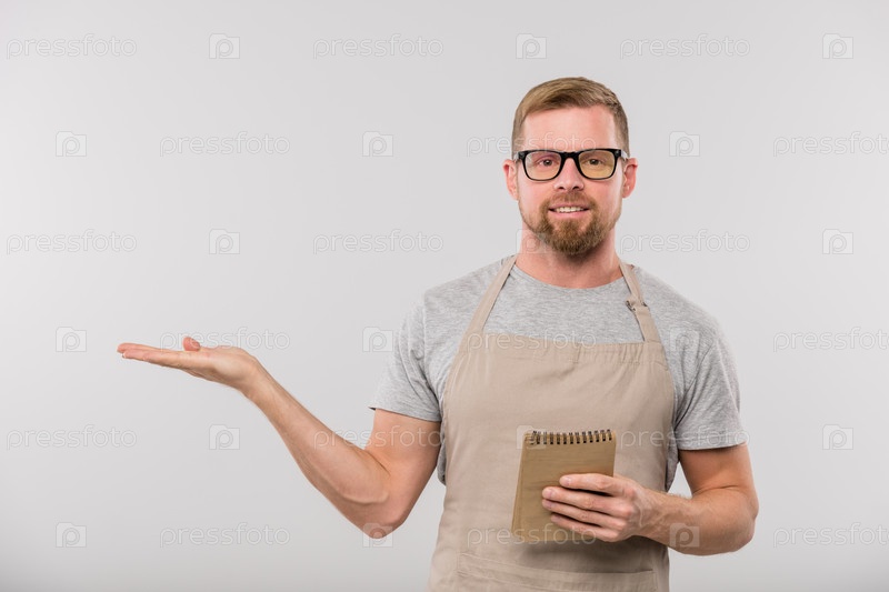 Счастливый молодой бородатый официант в фартуке и очках, показывающих в сторону