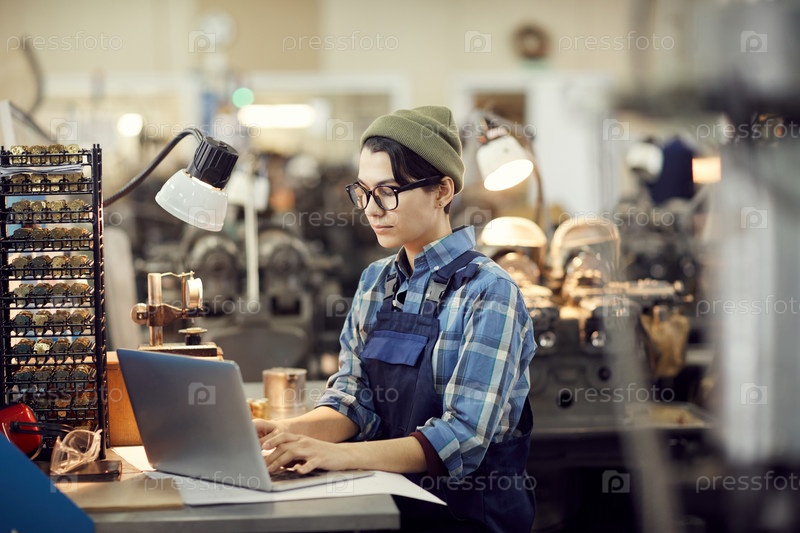 Серьезная квалифицированная фабричная девушка в очках, сидящая за столом и записывающая записи на ноутбуке во время работы на часовом заводе