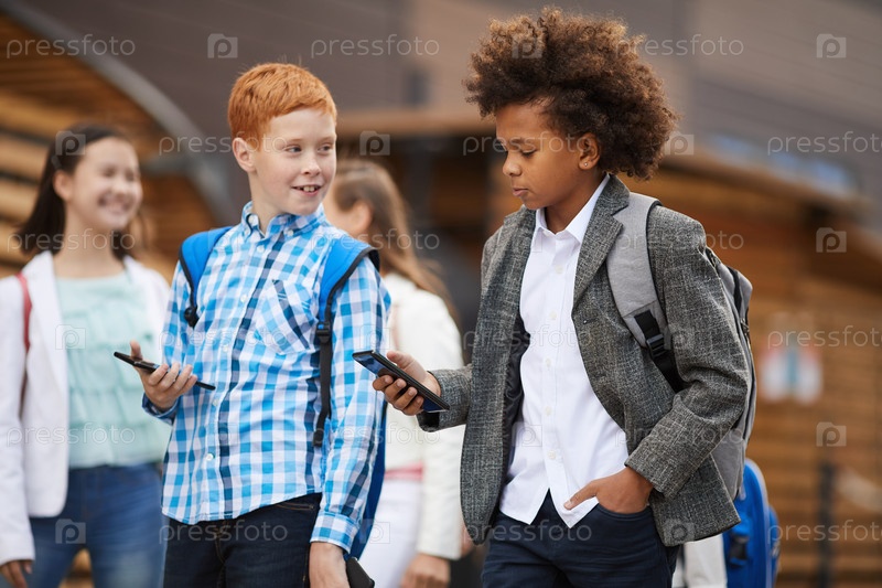 Друзья, использующие мобильные телефоны на улице