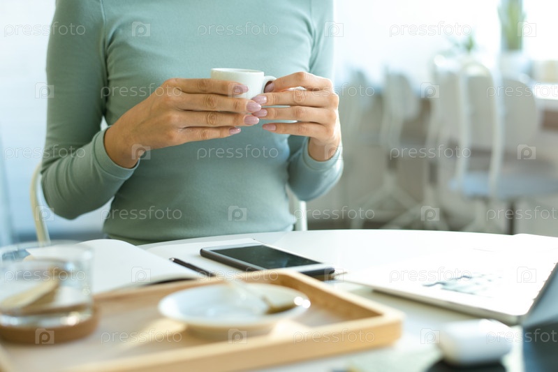 Руки молодой случайной женщины, держащей чашку чая над столом в кафе
