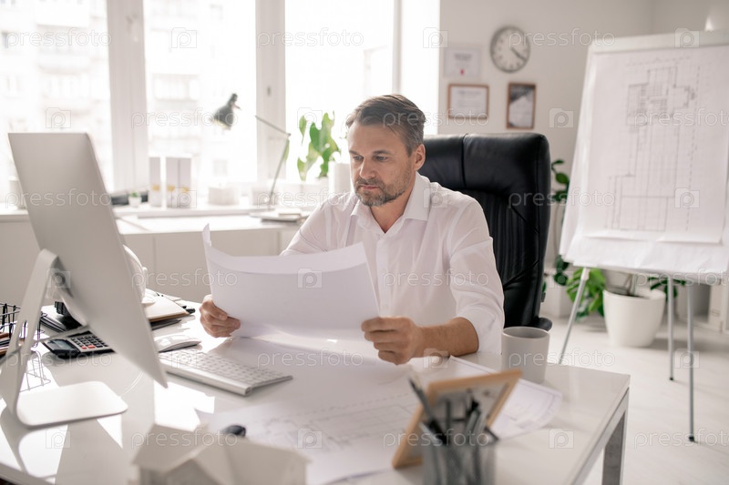 Зрелый серьезный архитектор в белой рубашке проверяет эскизы по рабочим местам