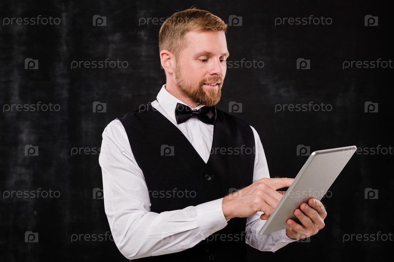 Элегантный официант из классного ресторана прокручивает планшет, когда ищет меню