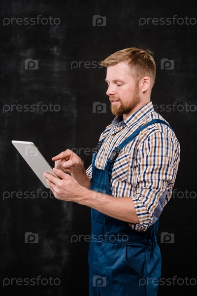 Молодой успешный бородатый техник в рабочей одежде, указывающий на экран сенсорной панели