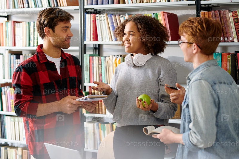 Милая девочка-подросток с зеленым яблоком объясняет что-то своим товарищам по группе