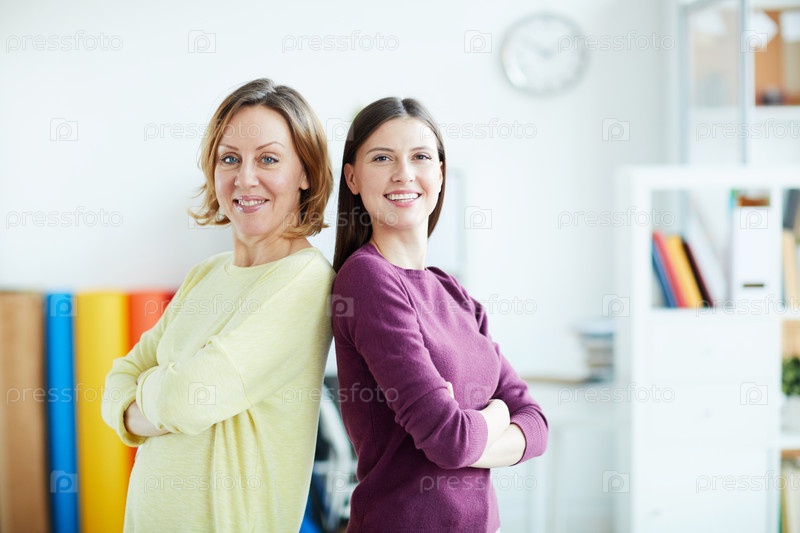 Веселые успешные уверенные дамы в ярких свитерах стоят спиной к спине и смотрят на камеру, стоя в современном офисе