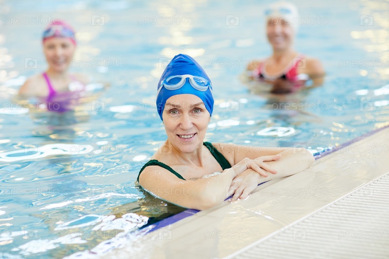 Улыбающаяся взрослая женщина позирует в бассейне