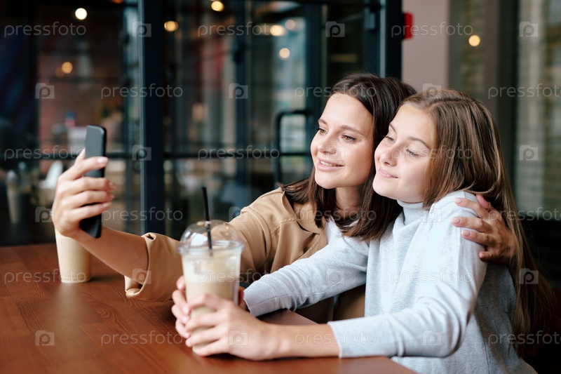 Любящая мать и дочь с напитками смотрят на камеру смартфона