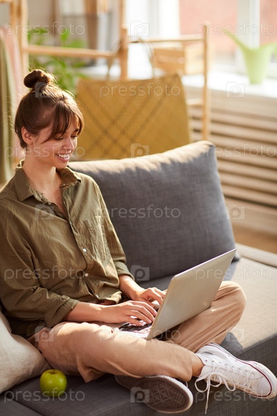 Веселая привлекательная молодая женщина с волосами, сидящая со скрещенными ногами и использующая ноутбук в собственном магазине