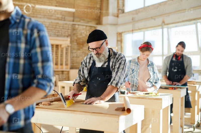 Серьезный жестокий старший плотник с серой бородой, носящий фартук и шапку со шляпой, стоящий за столом в фабричной мастерской и использующий измерительные инструменты