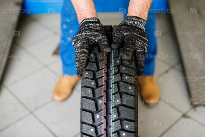 Перчаточные руки современного работника технического обслуживания, перемещающего новую шину вперед
