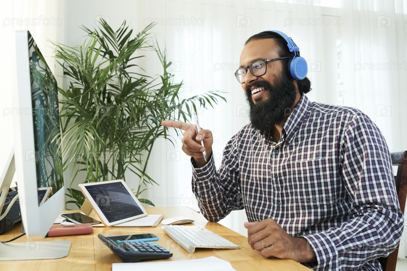 Бизнесмен проводит онлайн-конференцию на компьютере