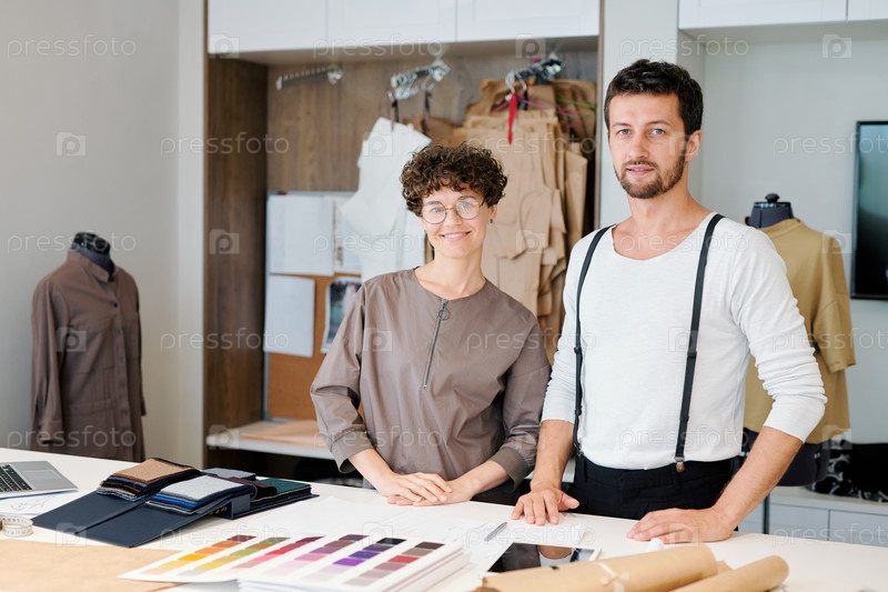 Два молодых креативных дизайнера предметов одежды, стоящих за столом