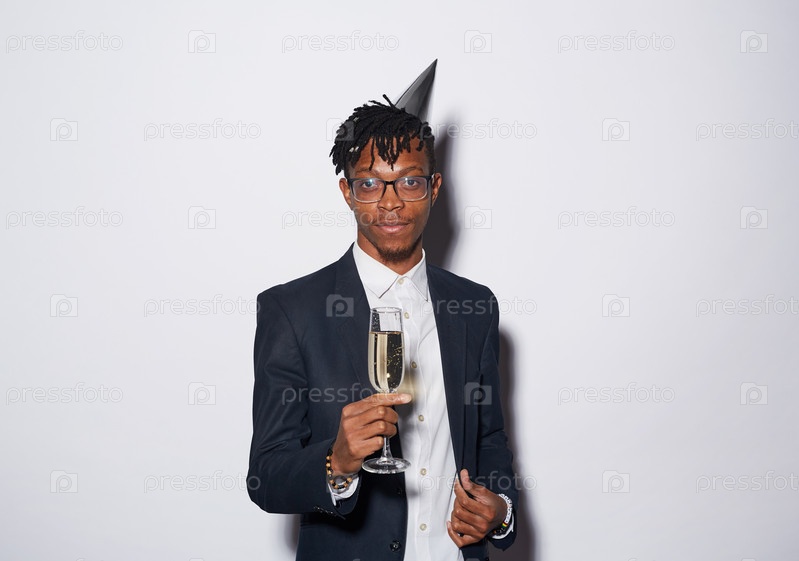 Мужчина позирует с шампанским на африканской вечеринке