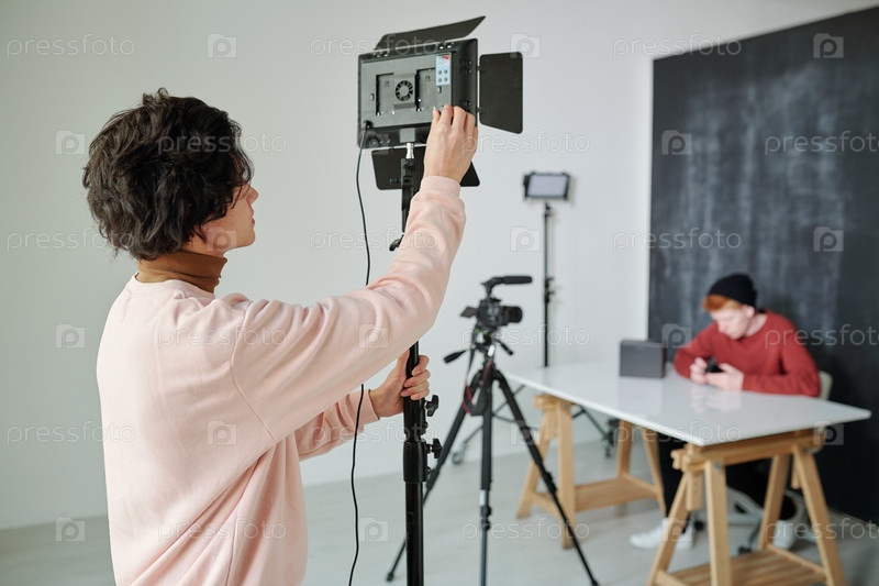 Молодой оператор в повседневной одежде готовит видеосъемочное оборудование