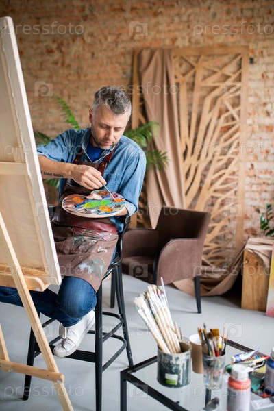 Современный художник в повседневной одежде и фартуке, смешивающий цвета на палитре