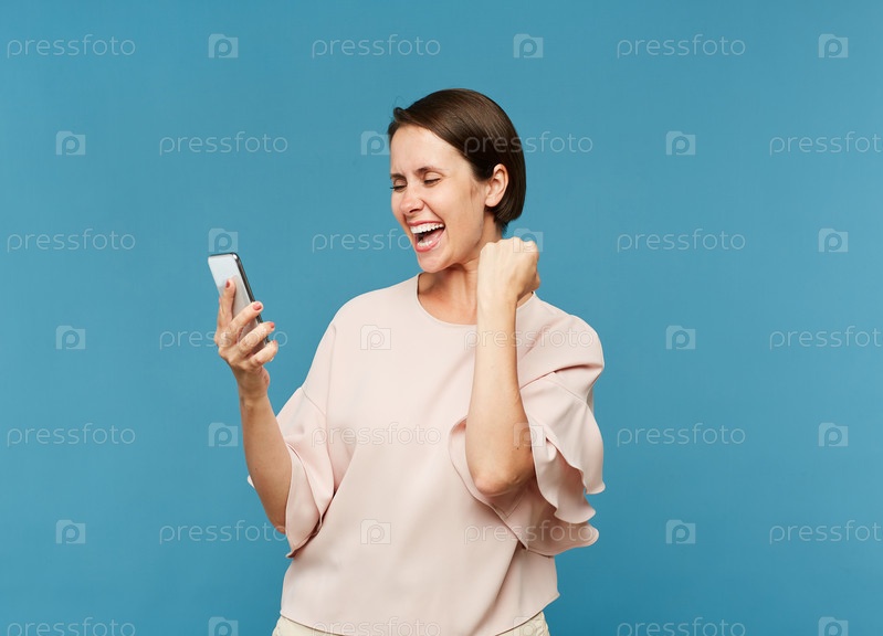 Молодая в восторге женщина смотрит на экран смартфона