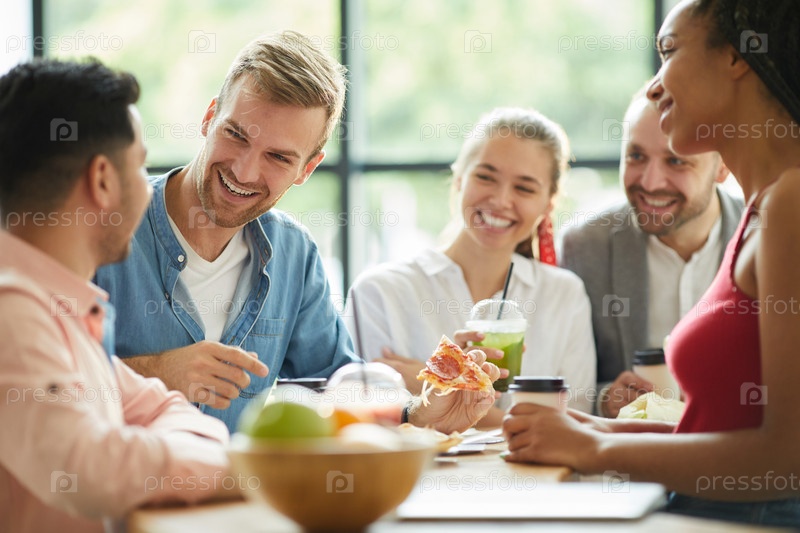 Веселые, взволнованные молодые мультиэтнические друзья в непринужденных нарядах стоят за столом и едят закуски, смеясь вместе