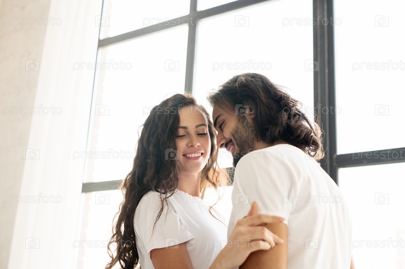Довольно молодая веселая женщина с зубчатой улыбкой, обнимающая мужа и разговаривающая с ней