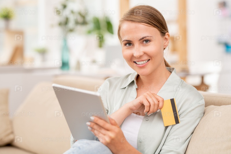 Счастливая девушка использует планшет для поиска товаров в Интернете и пластиковую карту для оплаты