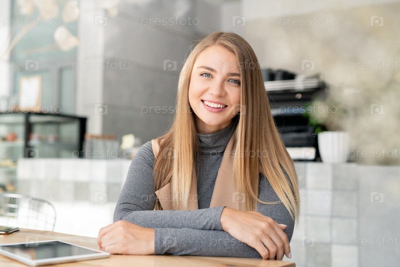 Счастливая молодая блондинка-бизнесвумен в умной повседневной одежде, расслабляющаяся в кафе