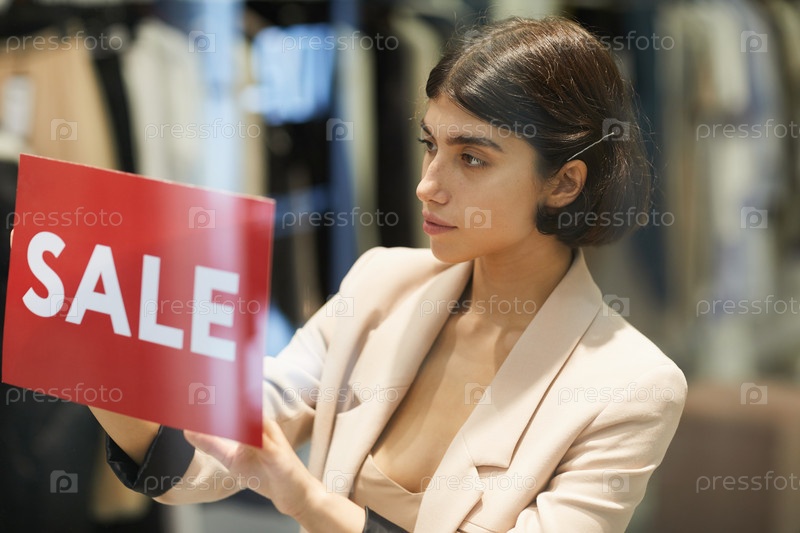 Висящий знак распродажи в магазине Женщина