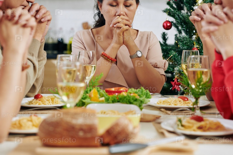 Семья молится за обеденным столом
