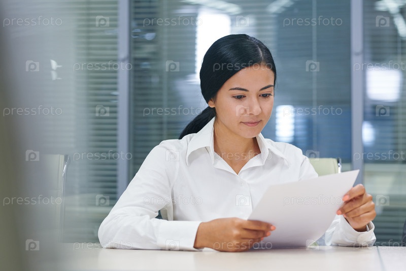 Красивая молодая бизнесвуменка читает финансовый документ