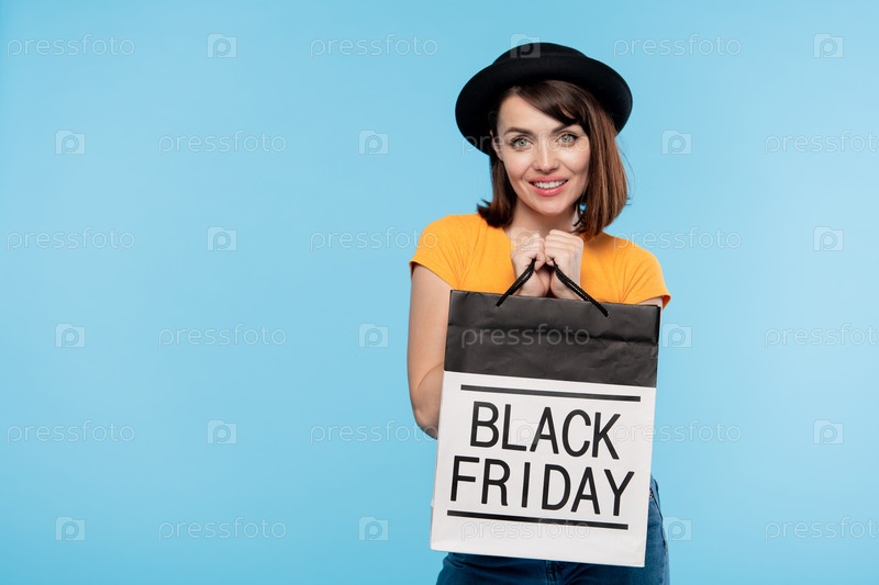 Счастливый молодой шопохолик держит бумажный пакет, хвастаясь покупкой