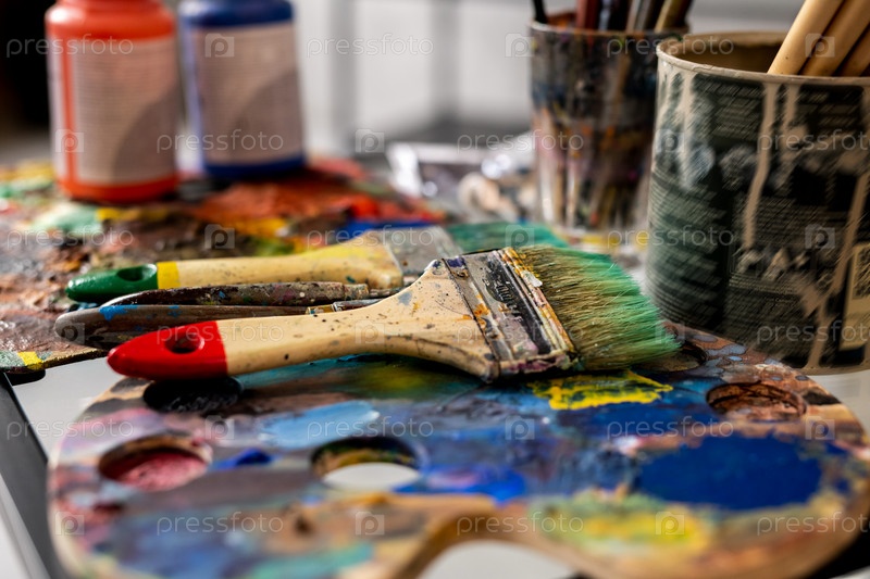 Группа кистей и палит на фоне бутылок с гуашей
