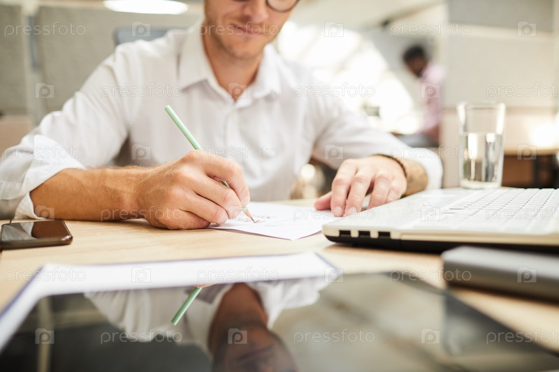 Близкий план молодого человека, сидящего за столом и рисующего схему на бумаге во время работы над дизайном проекта