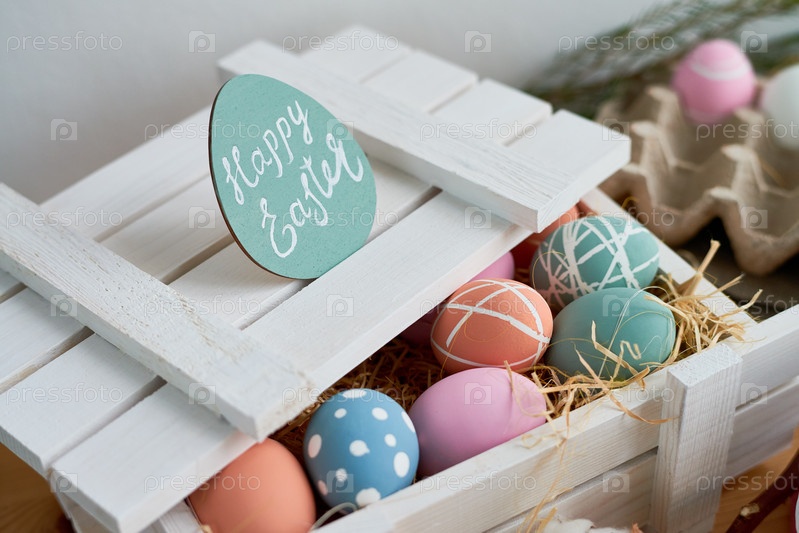 Пасхальный декор: крупный план белой деревянной коробки с открытой крышкой, наполненной творческими окрашенными яйцами в сена, счастливая пасхальная карточка