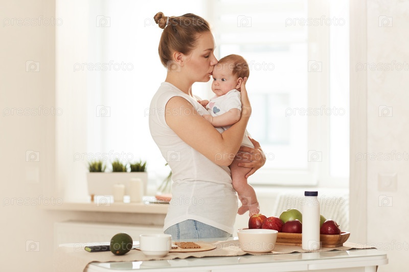 Молодая мать в белом футболке и синих джинсах целует маленького ребенка, стоящего на кухне рядом со столом