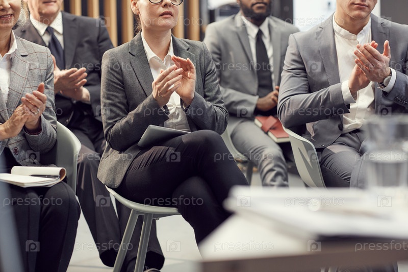Близкий план деловой аудитории, сидящей на стульях и хлопающей в ладоши спикеру на конференции