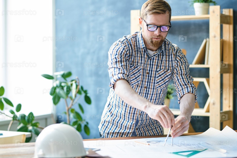 Серьезный сосредоточенный квалифицированный молодой строительный инженер в очках, стоящий за столом и использующий технический компас во время рисования круга на чертеже