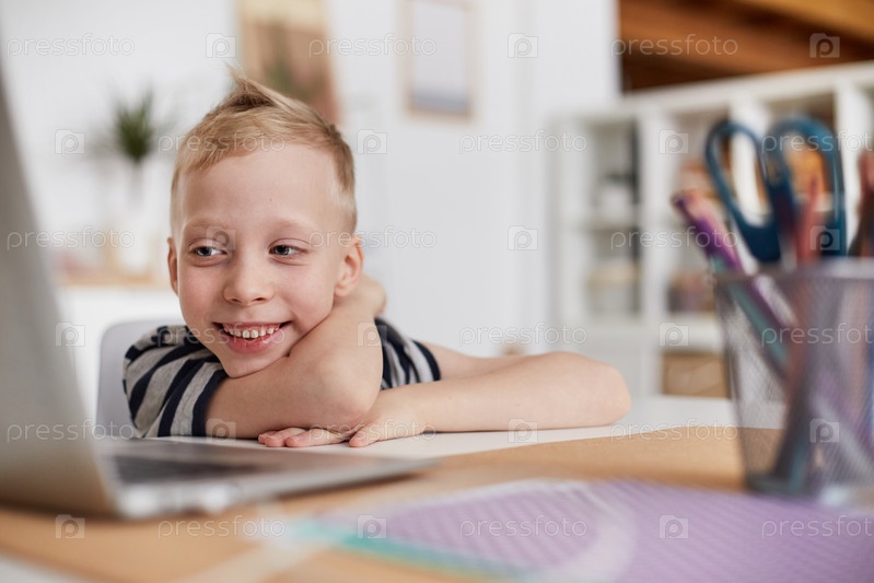 Веселый маленький мальчик с светлыми волосами сидит за столом и общается онлайн через приложение для ноутбука