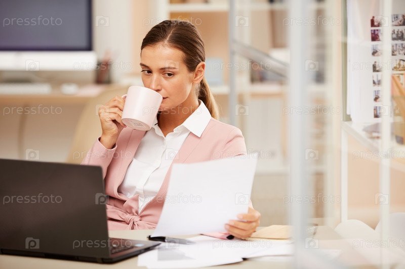 Женщина пьет кофе во время рабочего дня