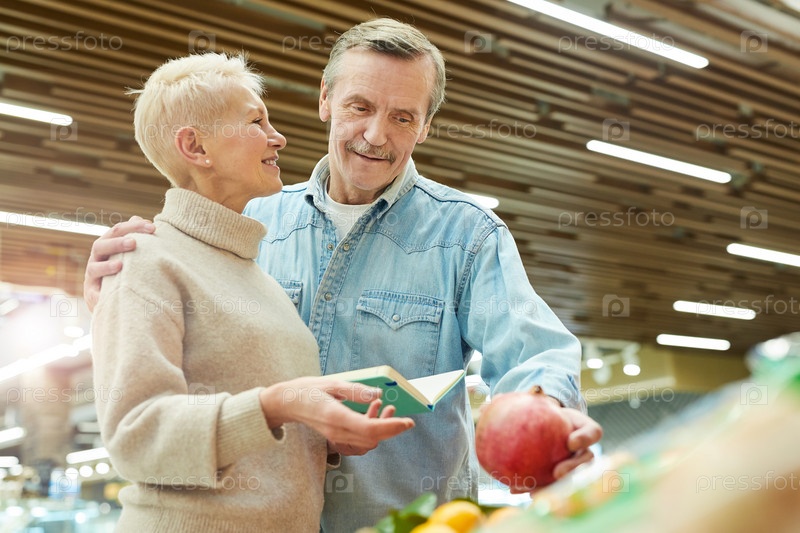 Улыбающаяся старшая пара покупает продукты на фермерском рынке