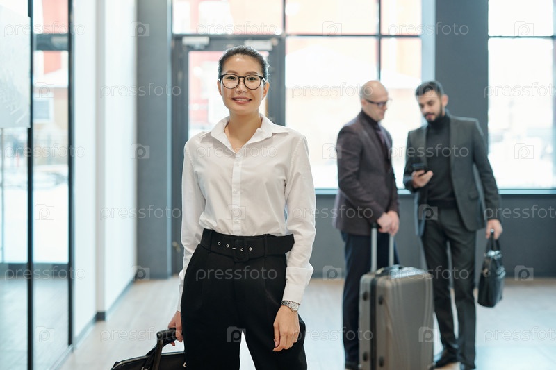 Счастливая молодая успешная бизнес-путешественница с багажом, которая смотрит на тебя