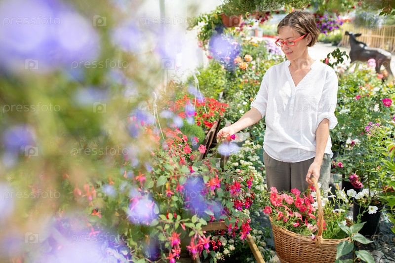 Счастливая случайная женщина с корзиной свежих цветов, смотрящая на новые виды петуний
