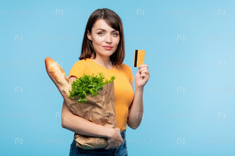 Довольно молодая потребительница с продуктами питания, показывающая свою кредитную карту