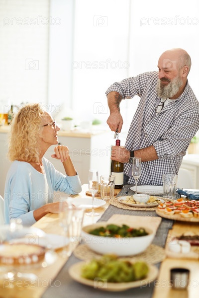 Веселый старший мужчина открывает бутылку вина