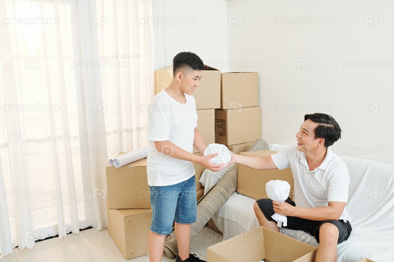 Отец и сын распаковывают вещи