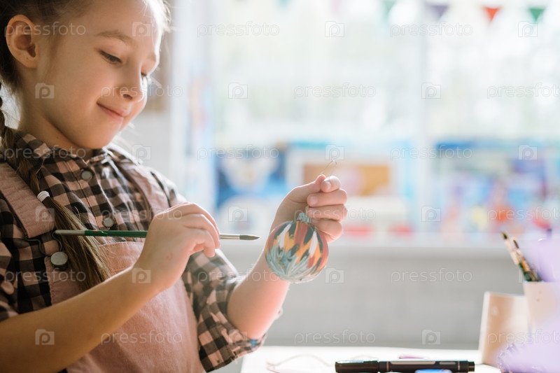 Счастливая школьница с изготовленным вручную декоративным рождественским шаром, рисуя его на уроке