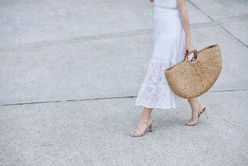 Женщина, идущая с соломенной сумкой