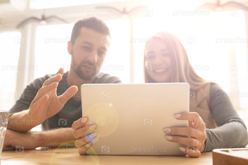 Молодая бизнес-женщина держит сенсорный планшет над столом во время деловой дискуссии